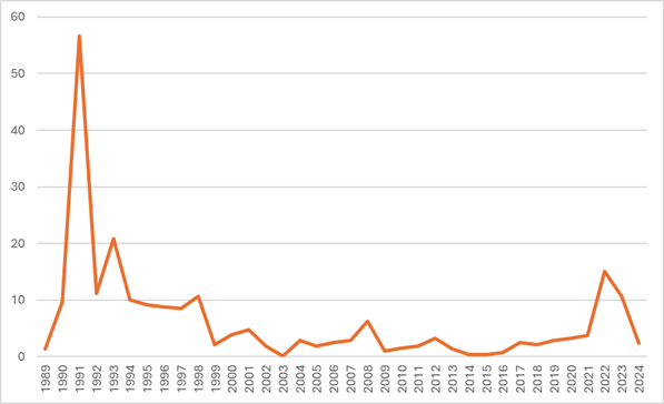 Graf 1: Meziroční míry inflace 1989 až 2024