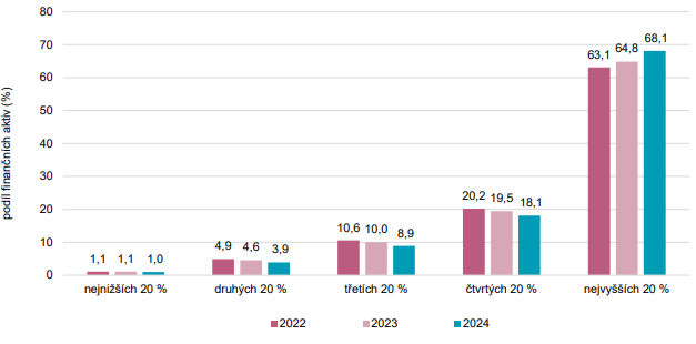 To ostatně velmi názorně ukazuje další graf, který dokumentuje podíl finančních aktiv jednotlivých kvintilů domácností (pětin) na celkových finančních aktivech (jde tedy o finanční majetek, nikoliv o nemovitosti a podobně, zároveň nejde o čisté jmění, nejsou tedy odečteny dluhy).
