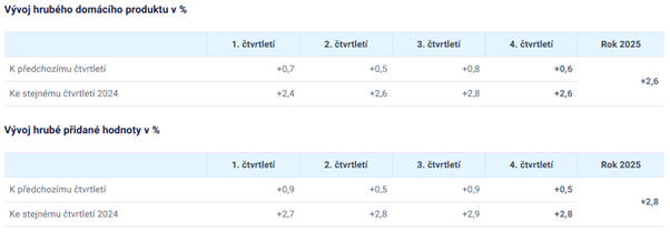 Český statistický úřad upravil směrem nahoru svoje dřívější předběžné odhady vývoje hrubého domácího produktu ve čtvrtém čtvrtletí a v celém roce 2025. Aktuální upřesněná data říkají, že v posledních třech měsících loňského roku vzrostl HDP ve stálých cenách a po očištění od sezónních vlivů meziročně (srovnání se 4Q 2024) o 2,6 %, mezičtvrtletně (srovnání s 3Q 2025) o 0,6 %. Za celý rok 2025 nyní ČSÚ odhaduje růst HDP na 2,6 %.