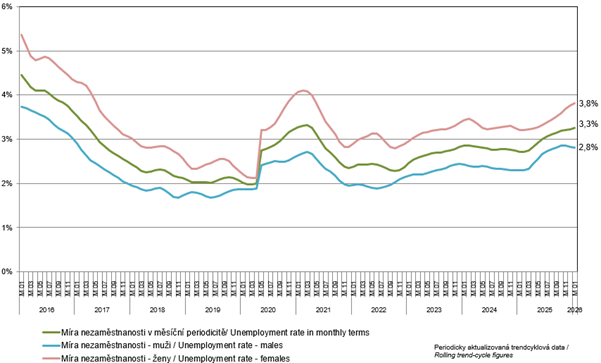 Nezaměstnanost sice na začátku roku 2026 znovu mírně vzrostla, ale stále je mimořádně nízká. Podíl nezaměstnaných k ekonomicky aktivním, to znamená k součtu zaměstnaných a nezaměstnaných, dosáhl v lednu 3,3 %. Meziročně se zvýšil o 0,5 procentního bodu. Poznámka: V této souvislosti upozorňujeme, že existují dvě mezinárodní metodiky zjišťování nezaměstnanosti a je tedy třeba odlišovat různá data.