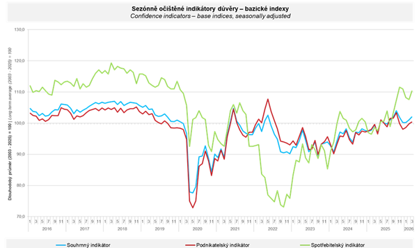 Souhrnný indikátor důvěry (tak zvaný indikátor ekonomického sentimentu) se v březnu meziměsíčně zvýšil o jeden bod na hodnotu 102,1. Relativně výjimečně ohlásily stejný směr obě složky ukazatele, když indikátor důvěry podnikatelů se mírně zvýšil o 0,6 bodu na hodnotu 100,4 a indikátor důvěry spotřebitelů vzrostl o 2,8 bodu na hodnotu 110,4. Konjunkturální průzkumy jsou relativně sofistikované výzkumy veřejného mínění, nejde o tradiční statistická data. Výhodou je ale přísná metodika a existence pomocných parametrů, kterými respondenti situaci porovnávají. Data jsou udávána v bodech, přičemž hladina 100 je dána dlouhodobým průměrem údajů (v současnosti 2003-2025). Jestliže je tedy údaj vyšší než sto, skupina je optimističtější co do výhledu pro následující měsíce, než jak bylo obvyklé v předchozích více než dvaceti letech.