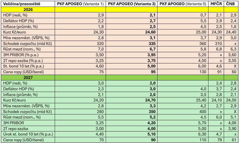 Důležitá poznámka: Predikce ČNB obsažená ve Zprávě o měnové politice – zima 2026 vznikla před vypuknutím hormuzské krize. Naopak predikce Ministerstva financí ČR je z dubna 2026 a novou situaci již reflektuje. U predikcí PKF APOGEO považujeme za nejvíce relevantní zvýrazněnou variantu 3.